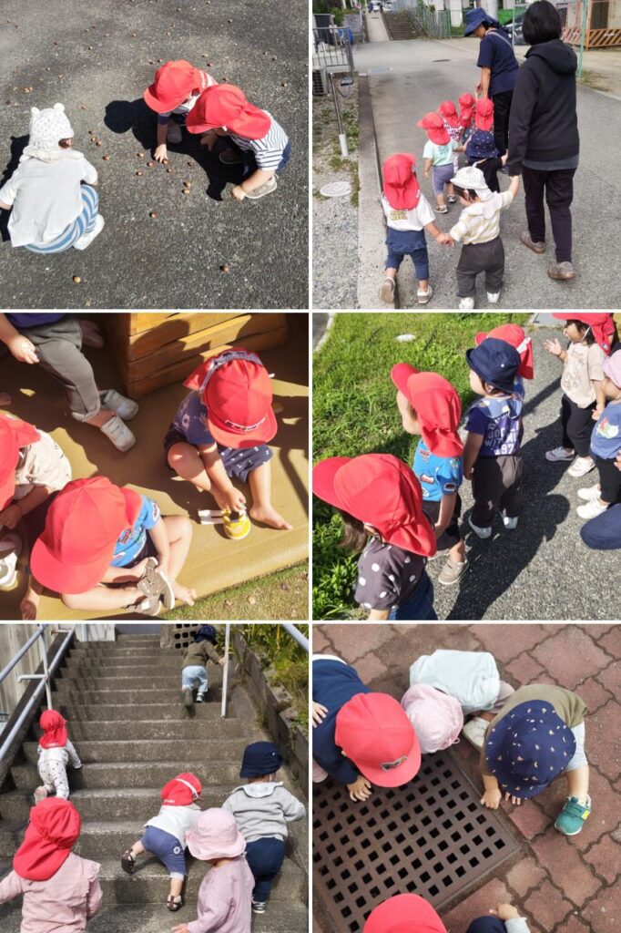 どんぐりも、見つけた穴に入れてみたり、どんぐりの帽子と合わせてみたりと、それぞれ試しながら遊ぶ姿が見られました。