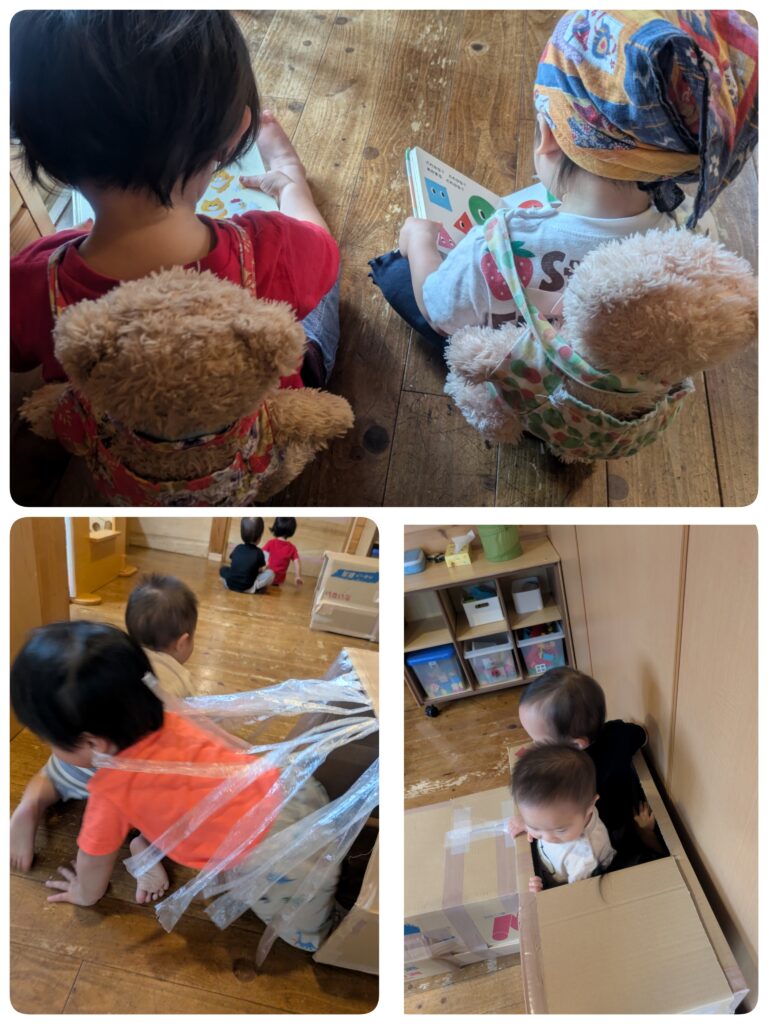ぬいぐるみをおんぶしたまま、お買い物に行くようにカバンを手に歩いたり絵本を読んだりと、小さなお母さん役を楽しんでいます。