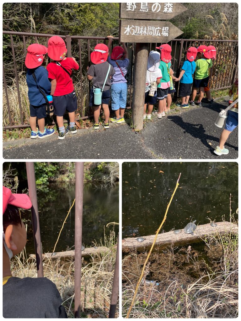 偶然にも甲羅干しをしている亀に出会えて、大興奮のみんな。